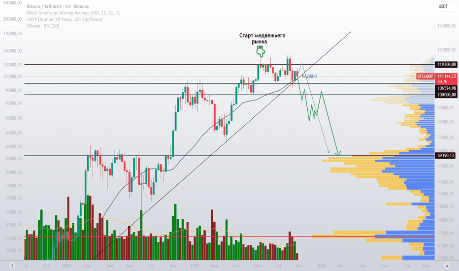 Более того, цена очень активно поджимается к трендовой текущего цикла роста и долгосрочной скользящей MA200d. Пробой подобных отметок всегда означали полноценный уход в медвежий рынок 🩸